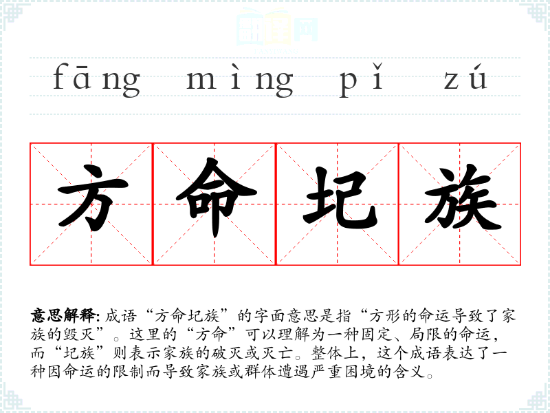成语“方命圮族”的字面意思是指“方形的命运导致了家族的毁灭”。这里的“方命”可以理解为一种固定、局限的命运,而“圮族”则表示家族的破灭或灭亡。整体上,这个成语表达了一种因命运的限制而导致家族或群体遭遇严重困境的含义。