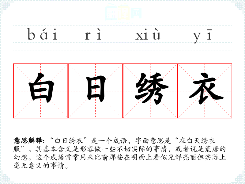 “白日绣衣”是一个成语,字面意思是“在白天绣衣服”。其基本含义是形容做一些不切实际的事情,或者说是荒唐的幻想。这个成语常常用来比喻那些在明面上看似光鲜亮丽但实际上毫无意义的事情。