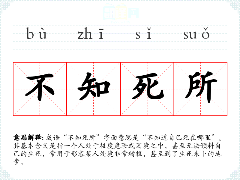 成语“不知死所”字面意思是“不知道自己死在哪里”。其基本含义是指一个人处于极度危险或困境之中,甚至无法预料自己的生死,常用于形容某人处境非常糟糕,甚至到了生死未卜的地步。