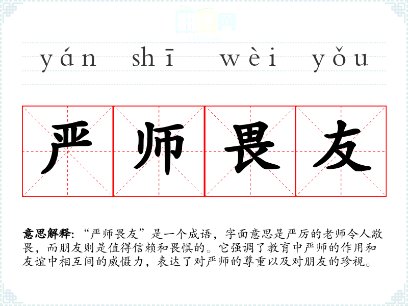 “严师畏友”是一个成语,字面意思是严厉的老师令人敬畏,而朋友则是值得信赖和畏惧的。它强调了教育中严师的作用和友谊中相互间的威慑力,表达了对严师的尊重以及对朋友的珍视。