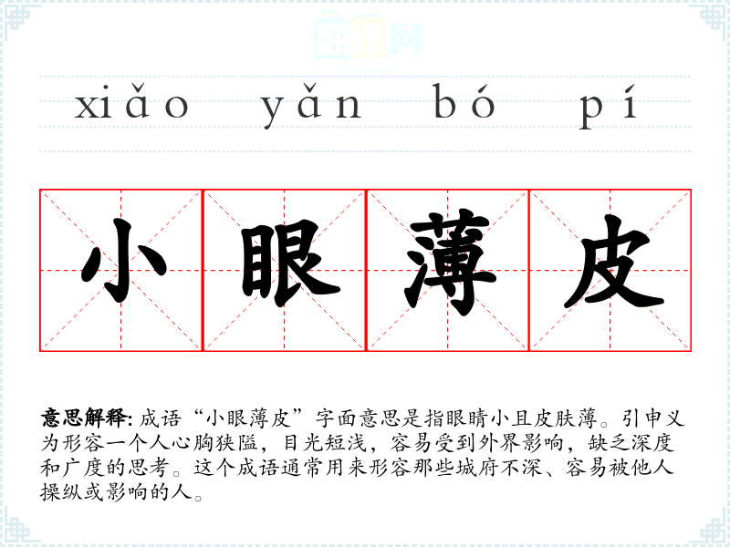 “小眼*皮”这个成语并没有明确的历史典故或文学出处,可能是基于民间的观察和总结。其构成的词汇“眼”和“皮”在汉语中常与人的外貌和心理特征相关联,反映了人们对个体性格的直观理解。