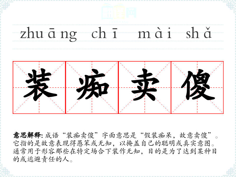 成语“装痴卖傻”字面意思是“假装痴呆,故意卖傻”。它指的是故意表现得愚笨或无知,以掩盖自己的聪明或真实意图。通常用于形容那些在特定场合下装作无知,目的是为了达到某种目的或逃避责任的人。