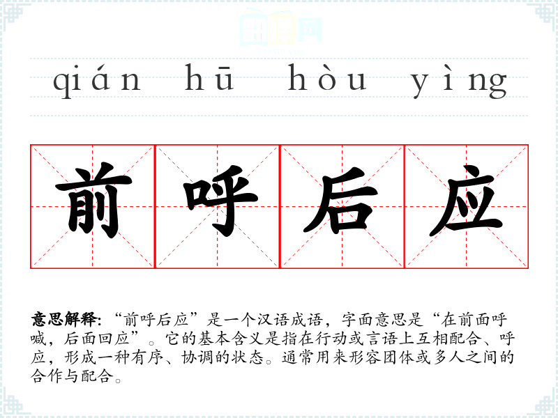 “前呼后应”是一个汉语成语,字面意思是“在前面呼喊,后面回应”。它的基本含义是指在行动或言语上互相配合、呼应,形成一种有序、协调的状态。通常用来形容团体或多人之间的合作与配合。