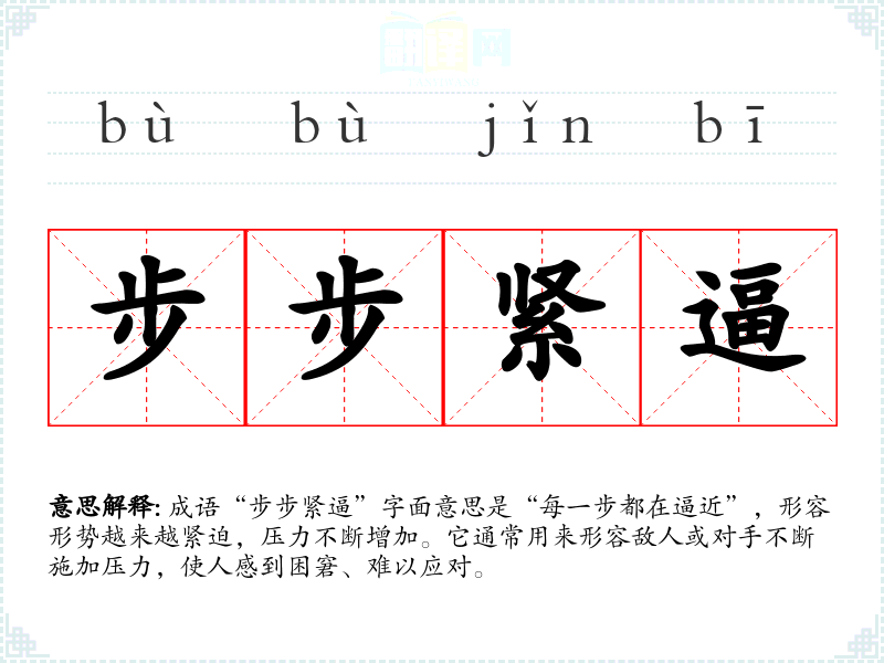 成语“步步紧逼”字面意思是“每一步都在逼近”,形容形势越来越紧迫,压力不断增加。它通常用来形容敌人或对手不断施加压力,使人感到困窘、难以应对。