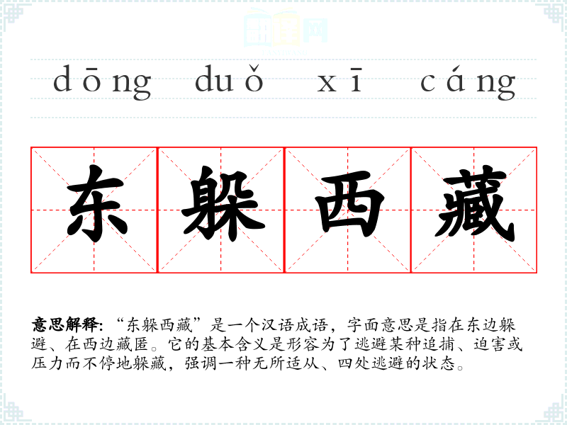“东躲**”是一个汉语成语,字面意思是指在东边躲避、在西边藏匿。它的基本含义是形容为了逃避某种追捕、迫害或压力而不停地躲藏,强调一种无所适从、四处逃避的状态。