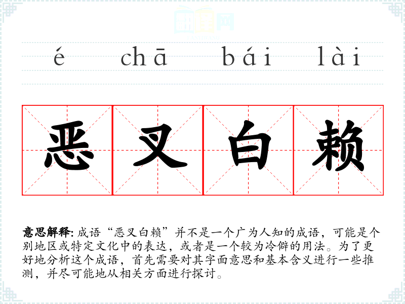成语“恶叉白赖”并不是一个广为人知的成语,可能是个别地区或特定文化中的表达,或者是一个较为冷僻的用法。为了更好地分析这个成语,首先需要对其字面意思和基本含义进行一些推测,并尽可能地从相关方面进行探讨。