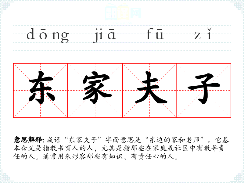 成语“东家夫子”字面意思是“东边的家和老师”。它基本含义是指教书育人的人,尤其是指那些在家庭或社区中有教导责任的人。通常用来形容那些有知识、有责任心的人。