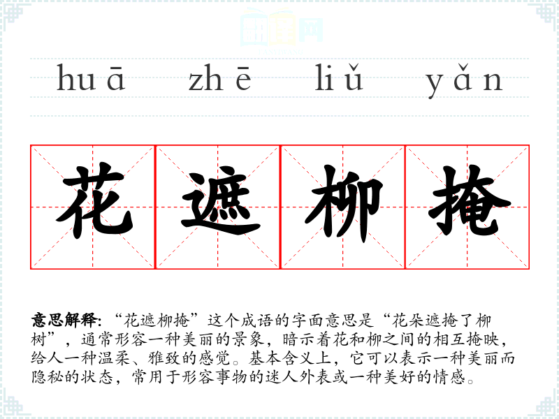 “花遮柳掩”这个成语的字面意思是“花朵遮掩了柳树”,通常形容一种美丽的景象,暗示着花和柳之间的相互掩映,给人一种温柔、雅致的感觉。基本含义上,它可以表示一种美丽而隐秘的状态,常用于形容事物的迷人外表或一种美好的情感。