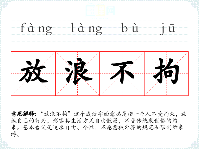 “放浪不拘”这个成语字面意思是指一个人不受拘束,放纵自己的行为,形容其生活方式自由散漫,不受传统或世俗的约束。基本含义是追求自由、个性,不愿意被外界的规范和限制所束缚。