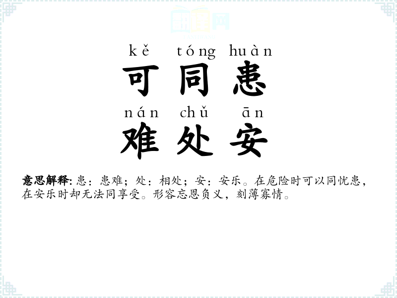 | 可同患,难处安 | 患:患难;处:相处;安:安乐。在危险时可以同忧患,在安乐时却无法同享受。形容忘恩负义,刻薄寡情。 |