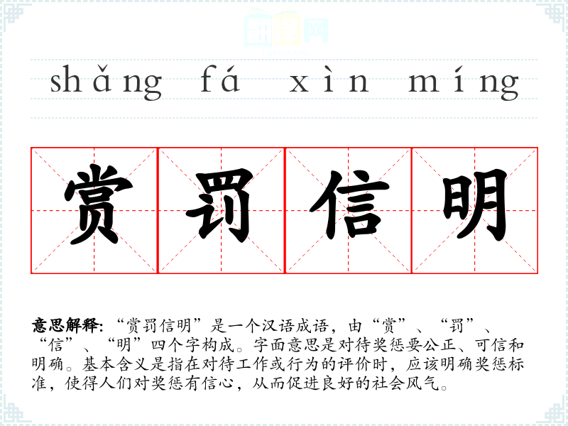 | 赏信罚明 | 形容处理事情严格而公正。同“赏罚分明”。 |