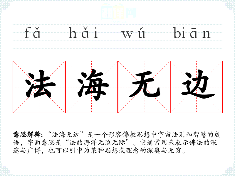 “法海无边”是一个形容**思想中宇宙法则和智慧的成语,字面意思是“法的海洋无边无际”。它通常用来表示佛法的深邃与广博,也可以引申为某种思想或理念的深奥与无穷。