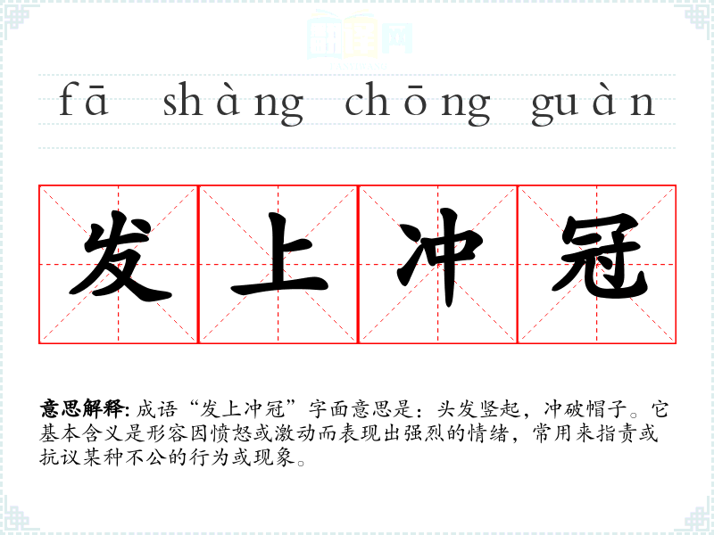 成语“发上冲冠”字面意思是:头发竖起,冲破帽子。它基本含义是形容因愤怒或激动而表现出强烈的情绪,常用来指责或抗议某种不公的行为或现象。