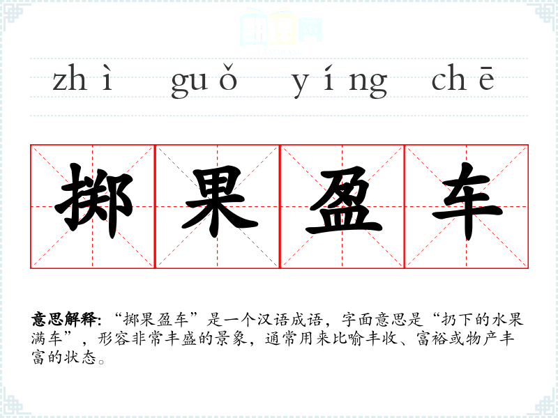 “掷果盈车”是一个汉语成语,字面意思是“扔下的水果满车”,形容非常丰盛的景象,通常用来比喻丰收、富裕或物产丰富的状态。