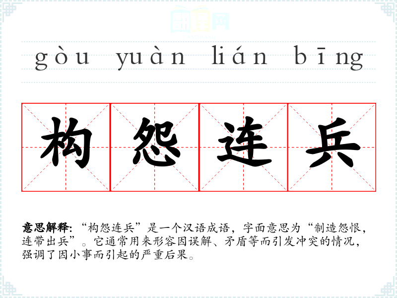 “构怨连兵”是一个汉语成语,字面意思为“制造怨恨,连带出兵”。它通常用来形容因误解、矛盾等而引发冲突的情况,强调了因小事而引起的严重后果。