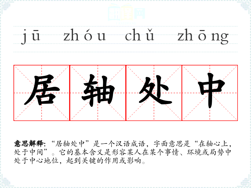 “居轴处中”是一个汉语成语,字面意思是“在轴心上,处于中间”。它的基本含义是形容某人在某个事情、环境或局势中处于中心地位,起到关键的作用或影响。