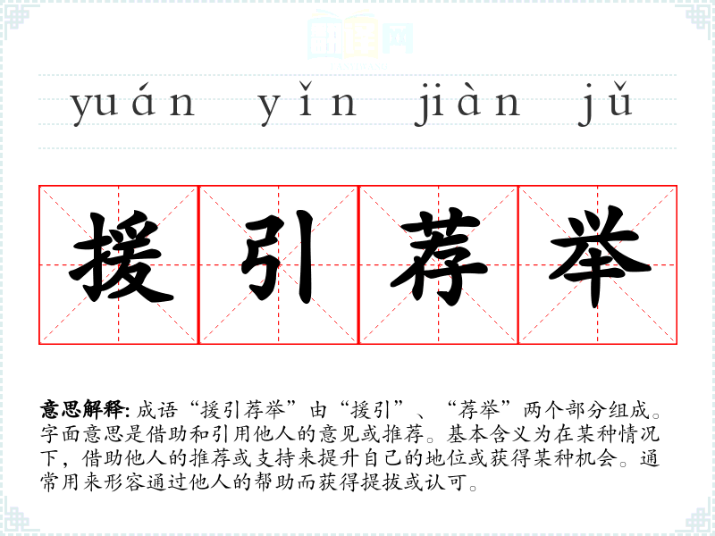 成语“援引荐举”由“援引”、“荐举”两个部分组成。字面意思是借助和引用他人的意见或推荐。基本含义为在某种情况下,借助他人的推荐或支持来提升自己的地位或获得某种机会。通常用来形容通过他人的帮助而获得提拔或认可。