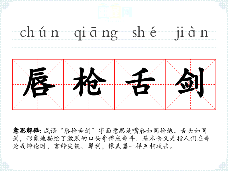 成语“唇枪舌剑”字面意思是嘴唇如同枪炮,舌头如同剑,形象地描绘了激烈的口头争辩或争斗。基本含义是指人们在争论或辩论时,言辞尖锐、犀利,像武器一样互相攻击。