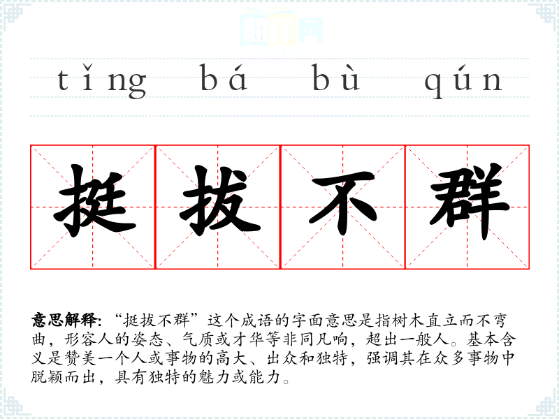 “挺拔不群”并没有明确的历史典故或文学出处,但它的构成元素“挺拔”与“不群”都可以在古典文学中找到类似的表达。特别是在对比中,常用“群”来表示一般的、普通的事物,而“挺拔”则常用来形容高大、笔直的树木,意指与众不同。在古代的文人雅士中,往往用来形容那些品德高尚、才华出众的人。