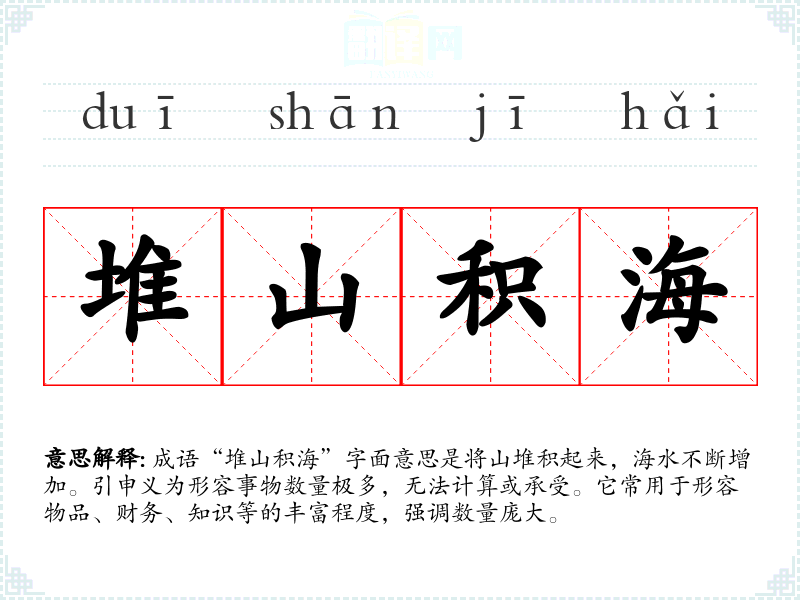 成语“堆山积海”字面意思是将山堆积起来,海水不断增加。引申义为形容事物数量极多,无法计算或承受。它常用于形容物品、财务、知识等的丰富程度,强调数量庞大。
