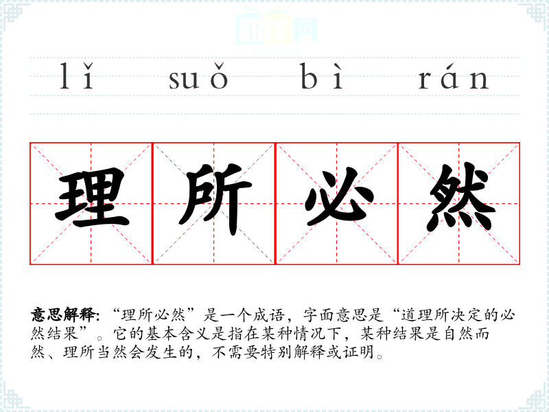 “理所必然”是一个成语,字面意思是“道理所决定的必然结果”。它的基本含义是指在某种情况下,某种结果是自然而然、理所当然会发生的,不需要特别解释或证明。