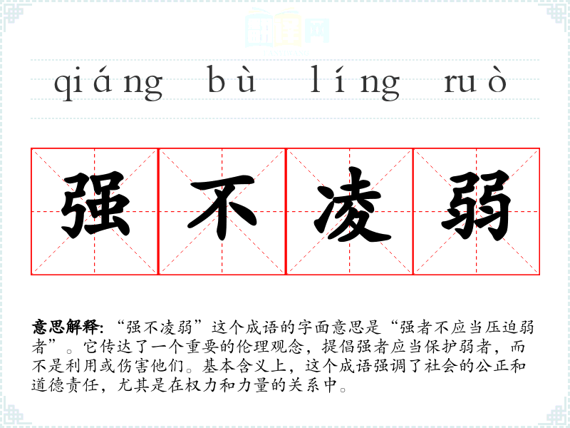 “强不凌弱”这个成语的字面意思是“强者不应当压迫弱者”。它传达了一个重要的伦理观念,提倡强者应当保护弱者,而不是利用或伤害他们。基本含义上,这个成语强调了社会的公正和道德责任,尤其是在权力和力量的关系中。
