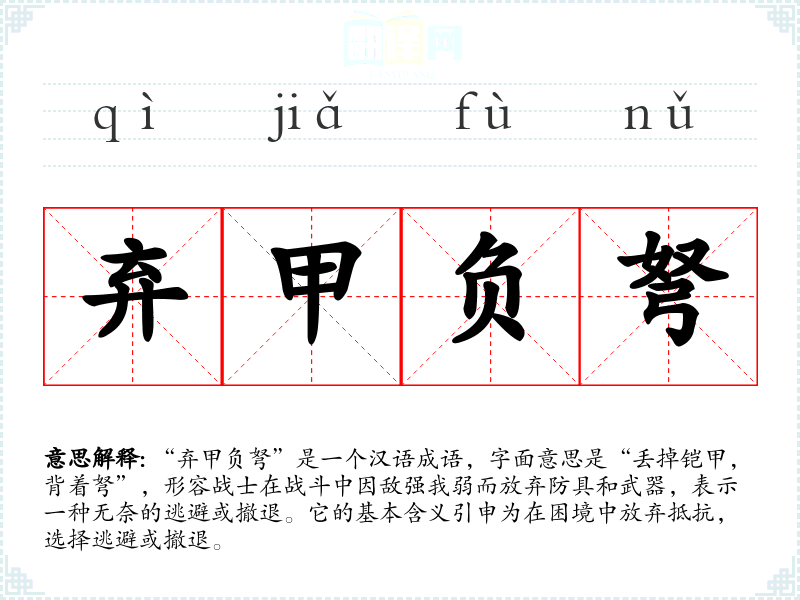 “弃甲负弩”是一个汉语成语,字面意思是“丢掉铠甲,背着弩”,形容战士在战斗中因敌强我弱而放弃防具和武器,表示一种无奈的逃避或撤退。它的基本含义引申为在困境中放弃抵抗,选择逃避或撤退。