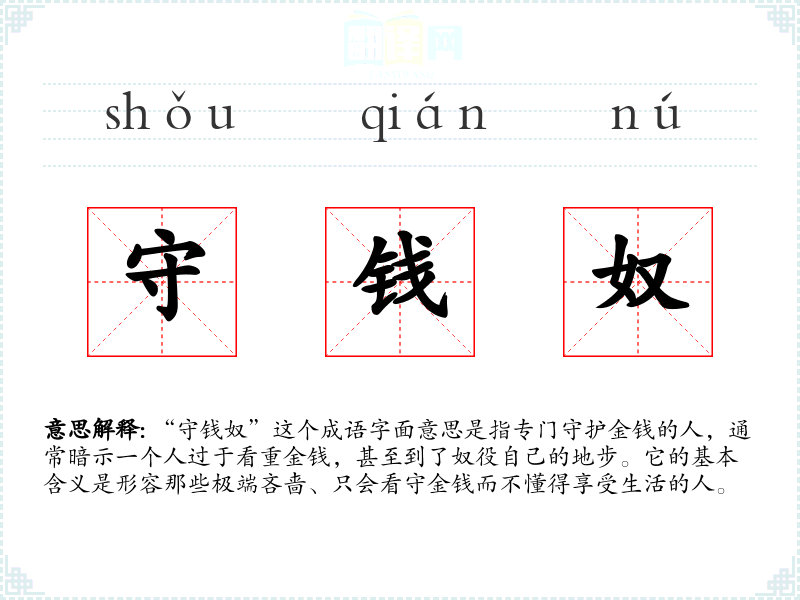 “守钱奴”这个成语字面意思是指专门守护金钱的人,通常暗示一个人过于看重金钱,甚至到了奴役自己的地步。它的基本含义是形容那些极端吝啬、只会看守金钱而不懂得享受生活的人。