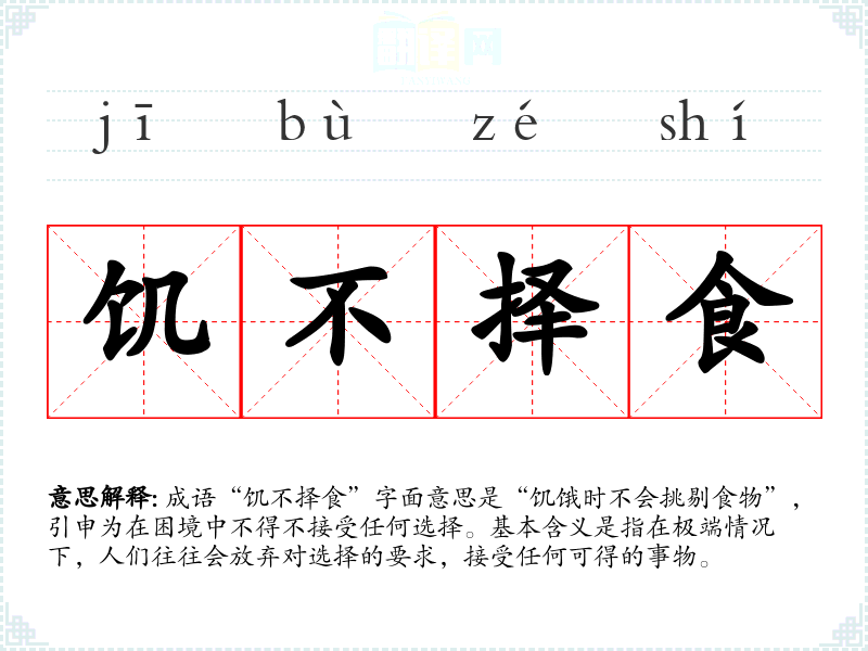 成语“饥不择食”字面意思是“饥饿时不会挑剔食物”,引申为在困境中不得不接受任何选择。基本含义是指在极端情况下,人们往往会放弃对选择的要求,接受任何可得的事物。