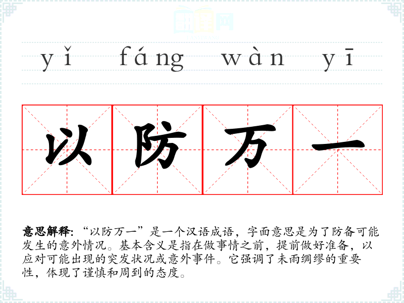 “以防万一”是一个汉语成语,字面意思是为了防备可能发生的意外情况。基本含义是指在做事情之前,提前做好准备,以应对可能出现的突发状况或意外**。它强调了未雨绸缪的重要性,体现了谨慎和周到的态度。