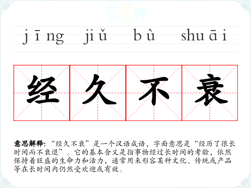“经久不衰”是一个汉语成语,字面意思是“经历了很长时间而不衰退”。它的基本含义是指事物经过长时间的考验,依然保持着旺盛的生命力和活力,通常用来形容某种文化、传统或产品等在长时间内仍然受欢迎或有效。