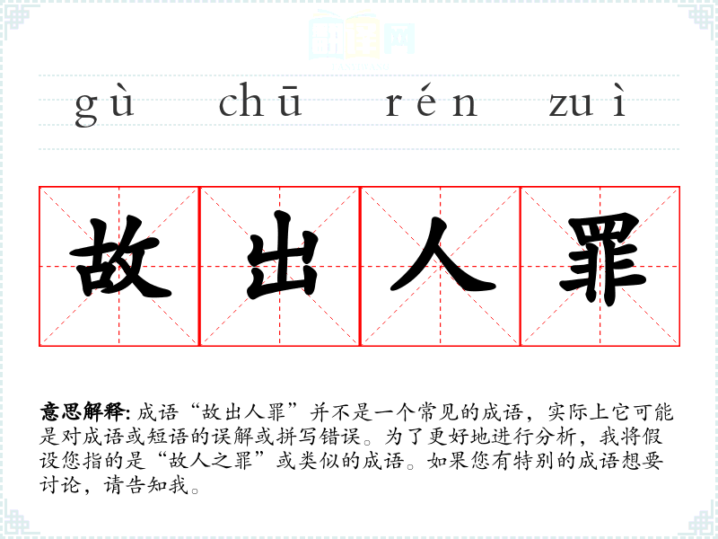 成语“故出人罪”并不是一个常见的成语,实际上它可能是对成语或短语的误解或拼写错误。为了更好地进行分析,我将假设您指的是“故人之罪”或类似的成语。如果您有特别的成语想要讨论,请告知我。