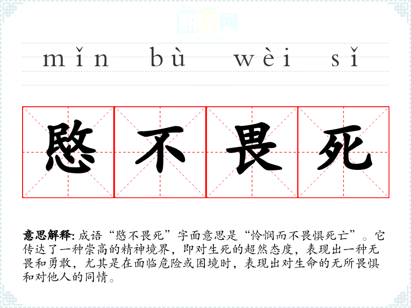 成语“愍不畏死”字面意思是“怜悯而不畏惧死亡”。它传达了一种崇高的精神境界,即对生死的超然态度,表现出一种无畏和勇敢,尤其是在面临危险或困境时,表现出对生命的无所畏惧和对他人的同情。