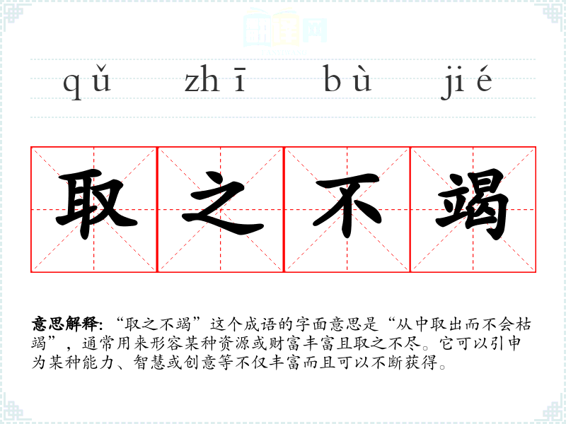 “取之不竭”这个成语的字面意思是“从中取出而不会枯竭”,通常用来形容某种资源或财富丰富且取之不尽。它可以引申为某种能力、智慧或创意等不仅丰富而且可以不断获得。