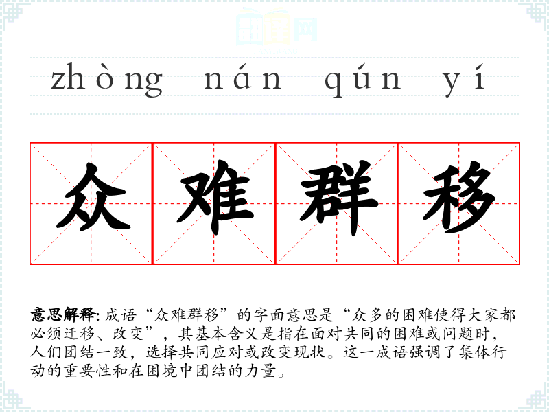 成语“众难群移”的字面意思是“众多的困难使得大家都必须迁移、改变”,其基本含义是指在面对共同的困难或问题时,人们团结一致,选择共同应对或改变现状。这一成语强调了集体行动的重要性和在困境中团结的力量。