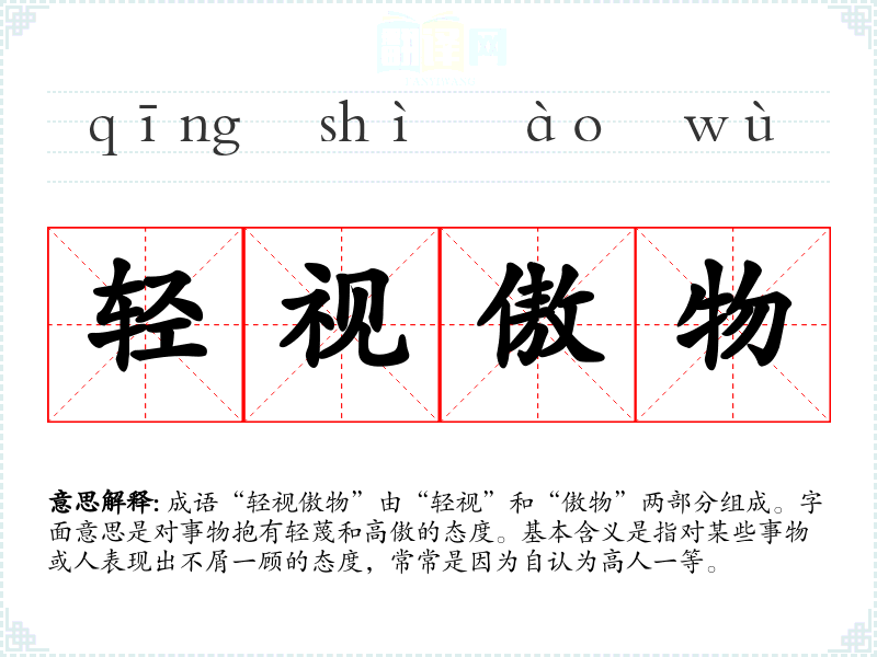 成语“轻视傲物”由“轻视”和“傲物”两部分组成。字面意思是对事物抱有轻蔑和高傲的态度。基本含义是指对某些事物或人表现出不屑一顾的态度,常常是因为自认为高人一等。
