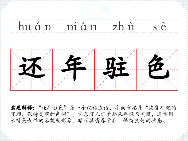 “还年驻色”是一个汉语成语,字面意思是“恢复年轻的容颜,保持美丽的色彩”。它形容人们看起来年轻而美丽,通常用来赞美女性的容貌或形象,暗示其青春常在,保持良好的状态。