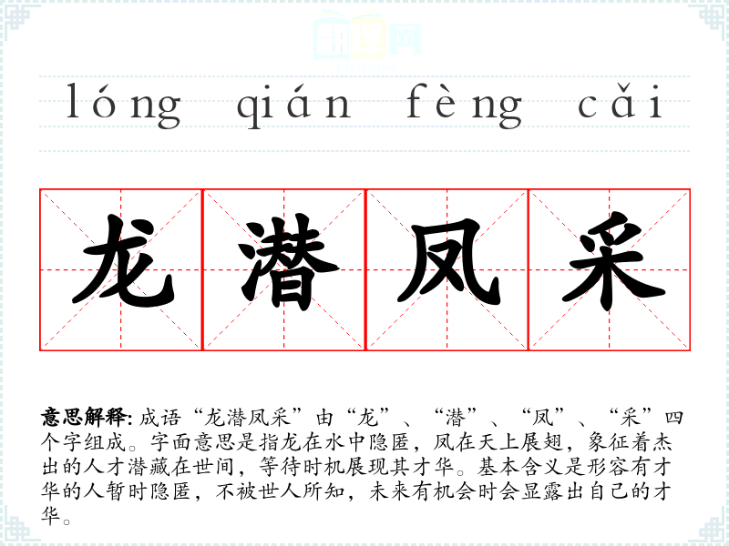 成语“龙潜凤采”由“龙”、“潜”、“凤”、“采”四个字组成。字面意思是指龙在水中隐匿,凤在天上展翅,象征着杰出的人才潜藏在世间,等待时机展现其才华。基本含义是形容有才华的人暂时隐匿,不被世人所知,未来有机会时会显露出自己的才华。