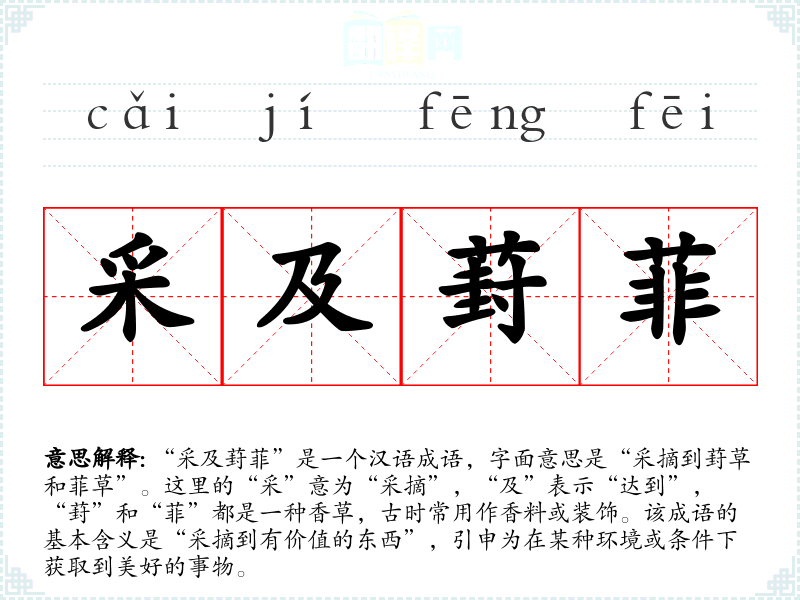 “采及葑菲”是一个汉语成语,字面意思是“采摘到葑草和菲草”。这里的“采”意为“采摘”,“及”表示“达到”,“葑”和“菲”都是一种香草,古时常用作香料或装饰。该成语的基本含义是“采摘到有价值的东西”,引申为在某种环境或条件下获取到美好的事物。
