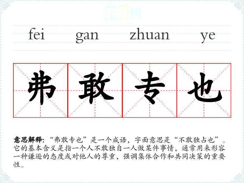“弗敢专也”是一个成语,字面意思是“不敢独占也”。它的基本含义是指一个人不敢独自一人做某件事情,通常用来形容一种谦逊的态度或对他人的尊重,强调集体合作和共同决策的重要性。