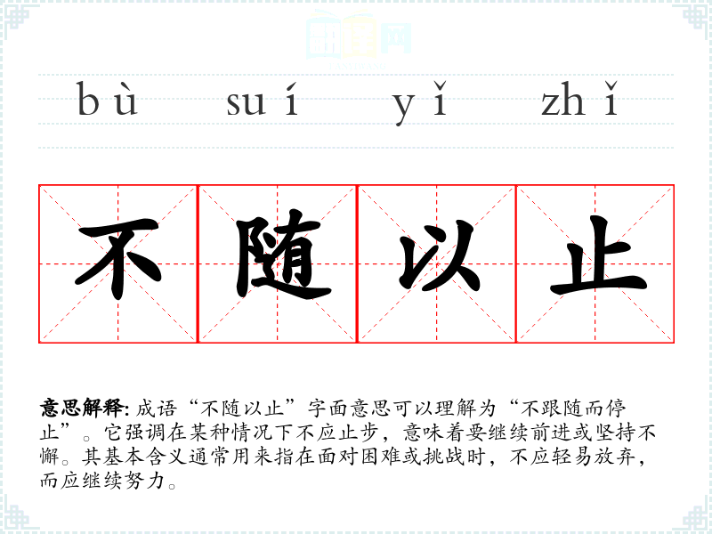成语“不随以止”字面意思可以理解为“不跟随而停止”。它强调在某种情况下不应止步,意味着要继续前进或坚持不懈。其基本含义通常用来指在面对困难或挑战时,不应轻易放弃,而应继续努力。