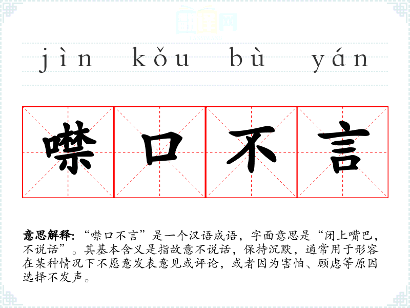 “噤口不言”是一个汉语成语,字面意思是“闭上嘴巴,不说话”。其基本含义是指故意不说话,保持沉默,通常用于形容在某种情况下不愿意发表意见或评论,或者因为害怕、顾虑等原因选择不发声。