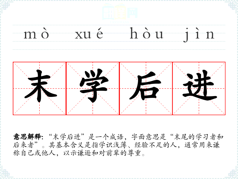 “末学后进”是一个成语,字面意思是“末尾的学者和后来者”。其基本含义是指学识浅、经验不足的人,通常用来谦称自己或他人,以示谦逊和对前辈的尊重。