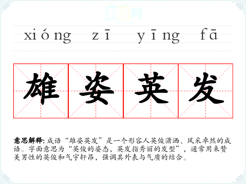 成语“雄姿英发”是一个形容人英俊潇洒、风采卓然的成语。字面意思为“英俊的姿态,英发指秀丽的发型”,通常用来赞美男性的英俊和气宇轩昂,强调其外表与气质的结合。