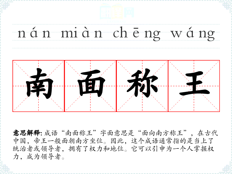 “南面称王”源自**古代的政治文化,尤其是君主制。在历史上,帝王坐朝时面朝南方,象征着权力的正统性和尊贵地位。这个成语常常与古代历史人物的统治地位有关,如汉朝的刘邦、唐朝的李世民等。它也与《周易》中关于南方的象征意涵有关,南方常被视为光明与繁荣的象征。