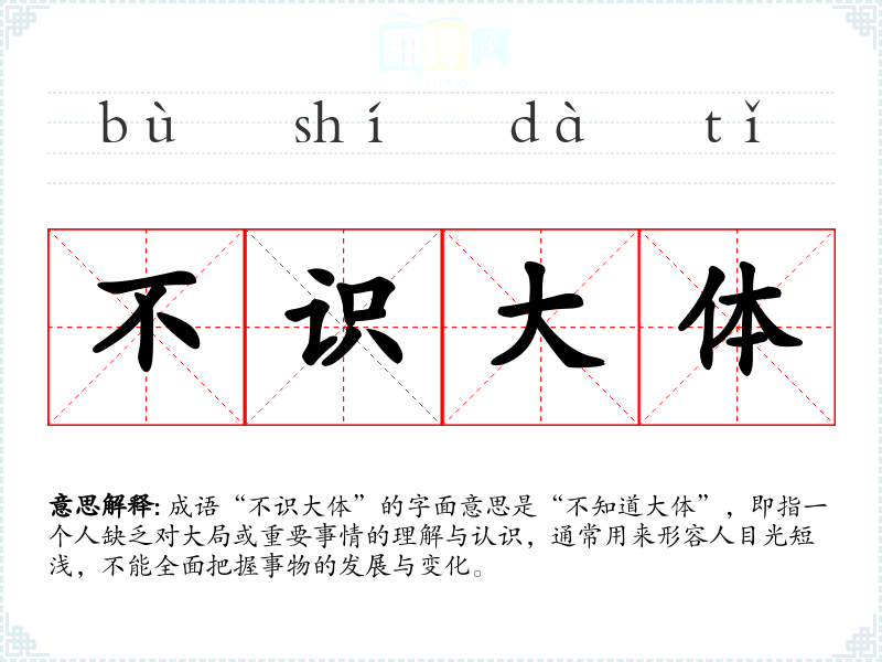 成语“不识大体”的字面意思是“不知道大体”,即指一个人缺乏对大局或重要事情的理解与认识,通常用来形容人目光短浅,不能全面把握事物的发展与变化。