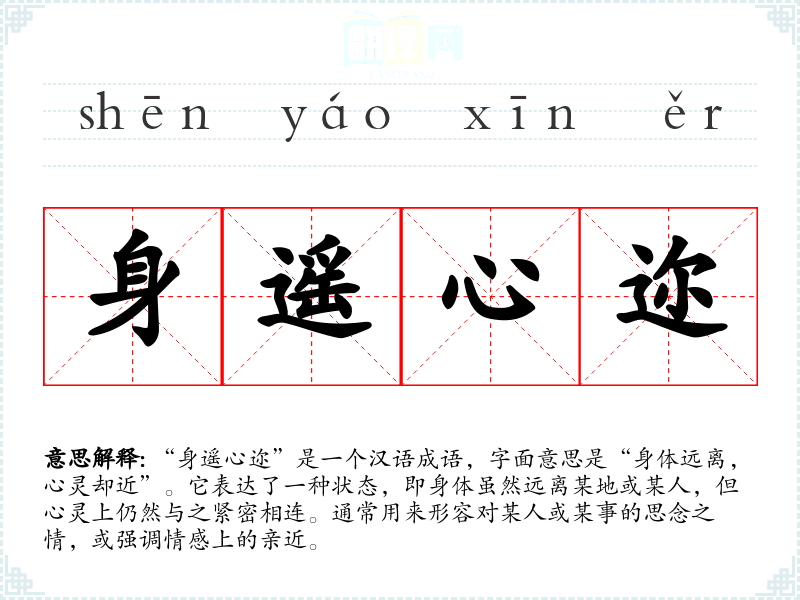 “身遥心迩”是一个汉语成语,字面意思是“身体远离,心灵却近”。它表达了一种状态,即身体虽然远离某地或某人,但心灵上仍然与之紧密相连。通常用来形容对某人或某事的思念之情,或强调情感上的亲近。