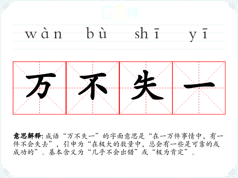 成语“万不失一”的字面意思是“在一万件事情中,有一件不会失去”,引申为“在极大的数量中,总会有一些是可靠的或成功的”。基本含义为“几乎不会出错”或“极为肯定”。