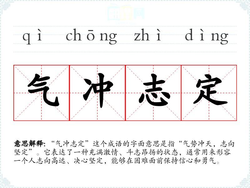 “气冲志定”这个成语的字面意思是指“气势冲天,志向坚定”。它表达了一种充满激情、斗志昂扬的状态,通常用来形容一个人志向高远、决心坚定,能够在困难面前保持信心和勇气。