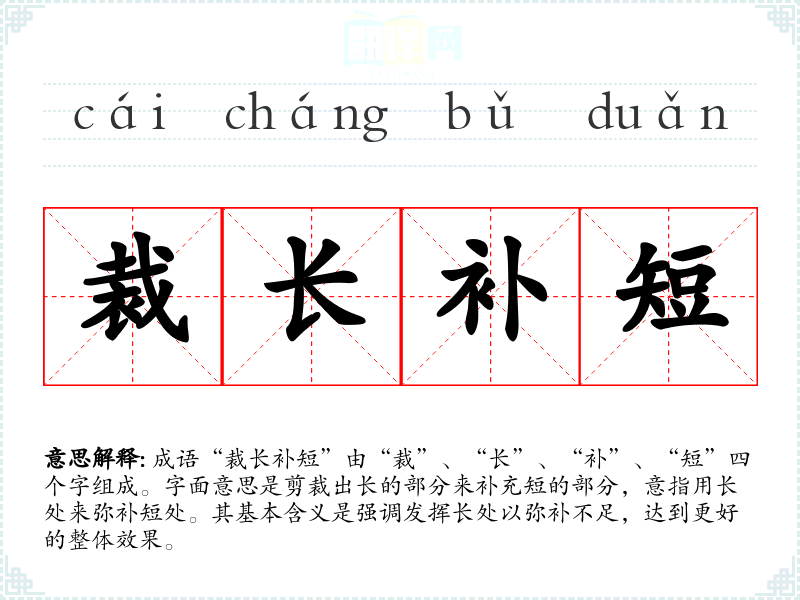 成语“裁长补短”由“裁”、“长”、“补”、“短”四个字组成。字面意思是剪裁出长的部分来补充短的部分,意指用长处来弥补短处。其基本含义是强调发挥长处以弥补不足,达到更好的整体效果。